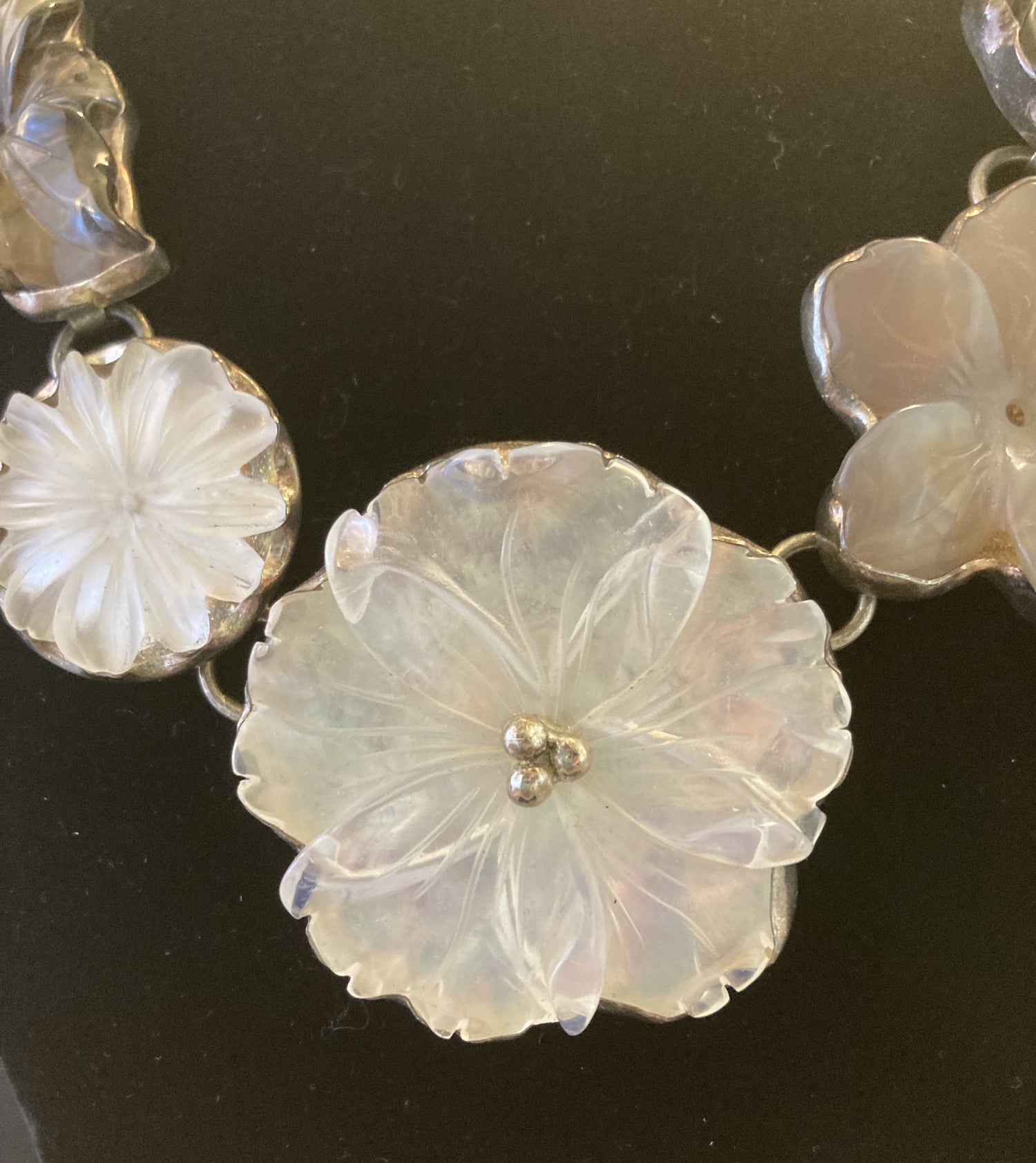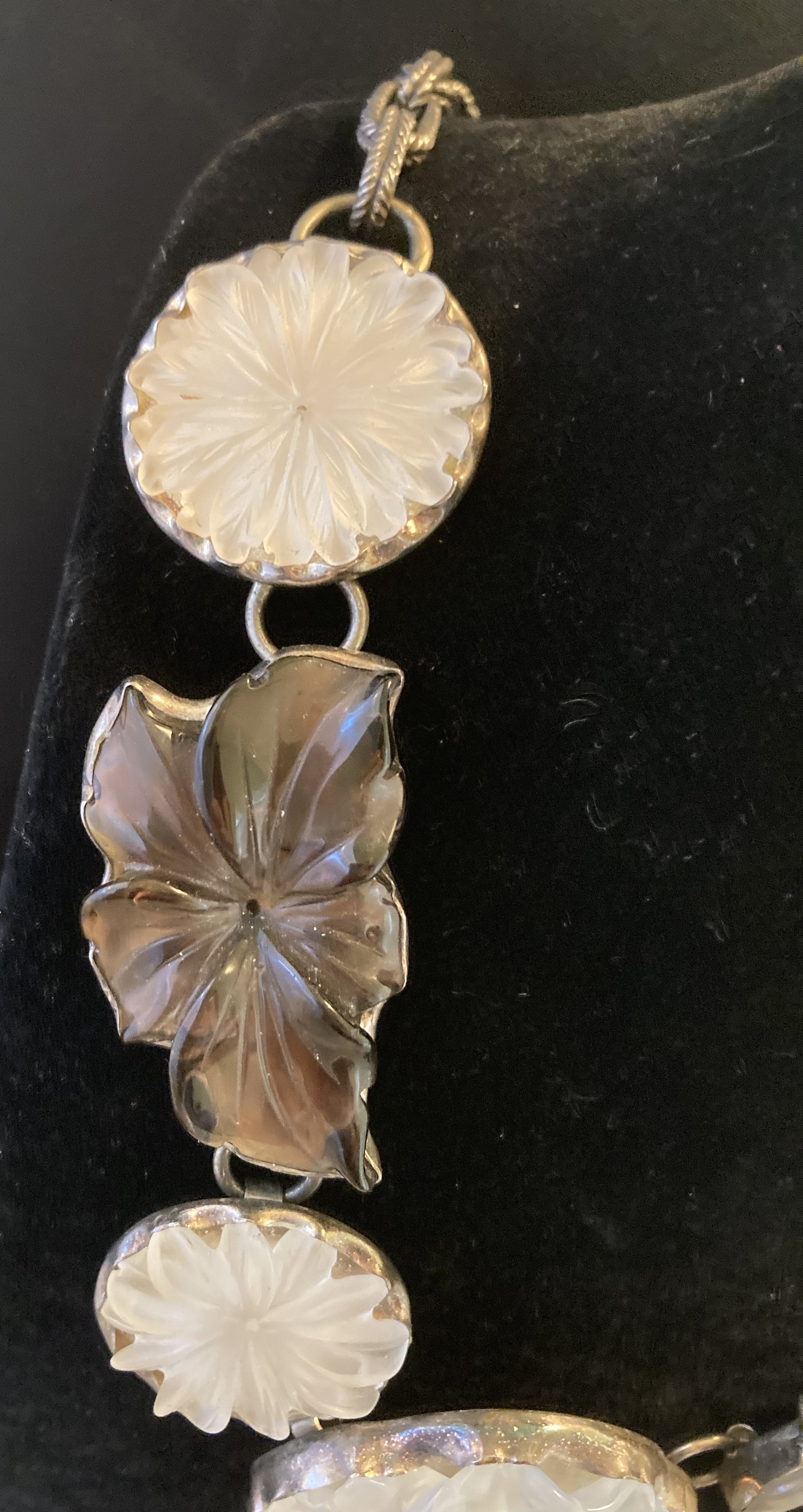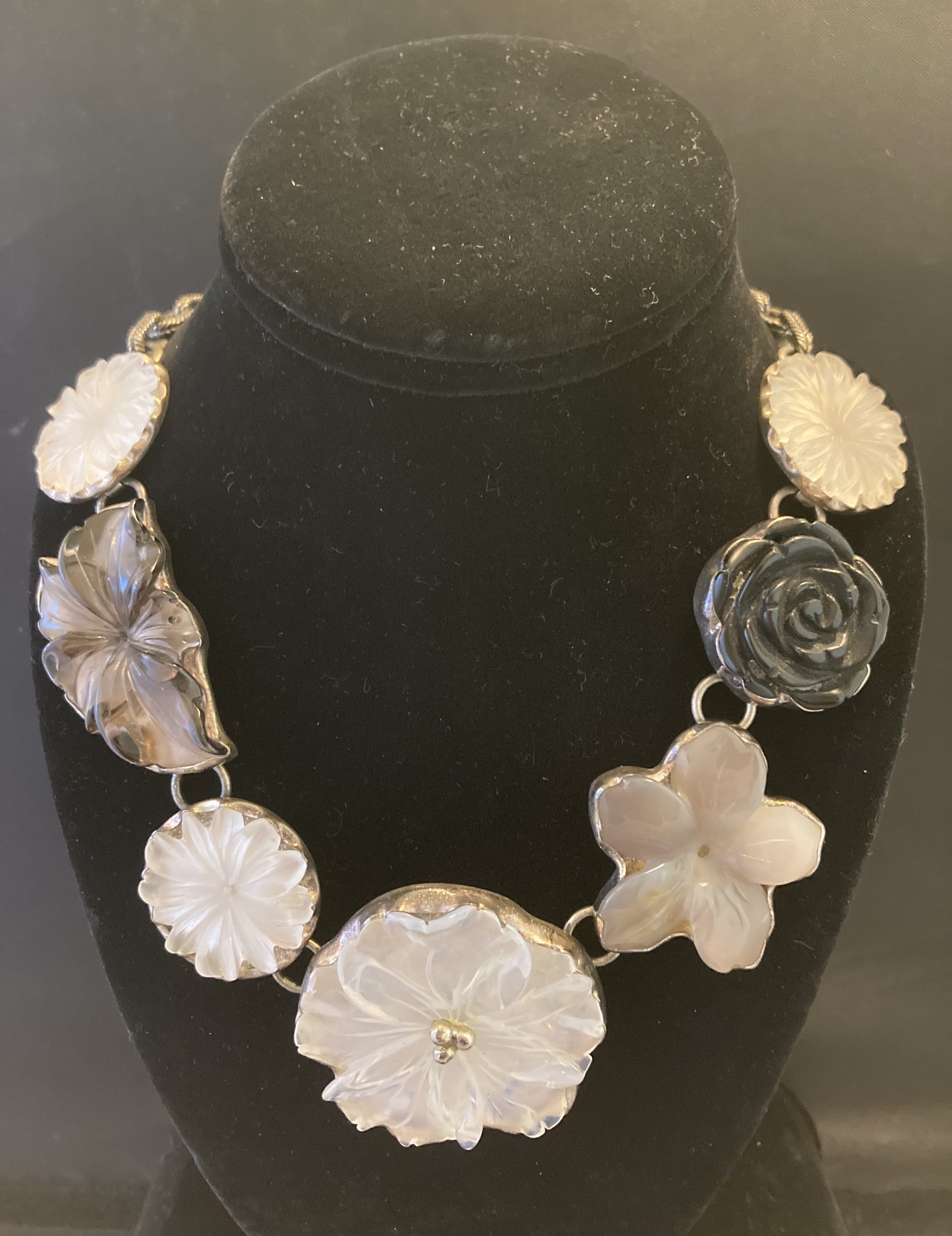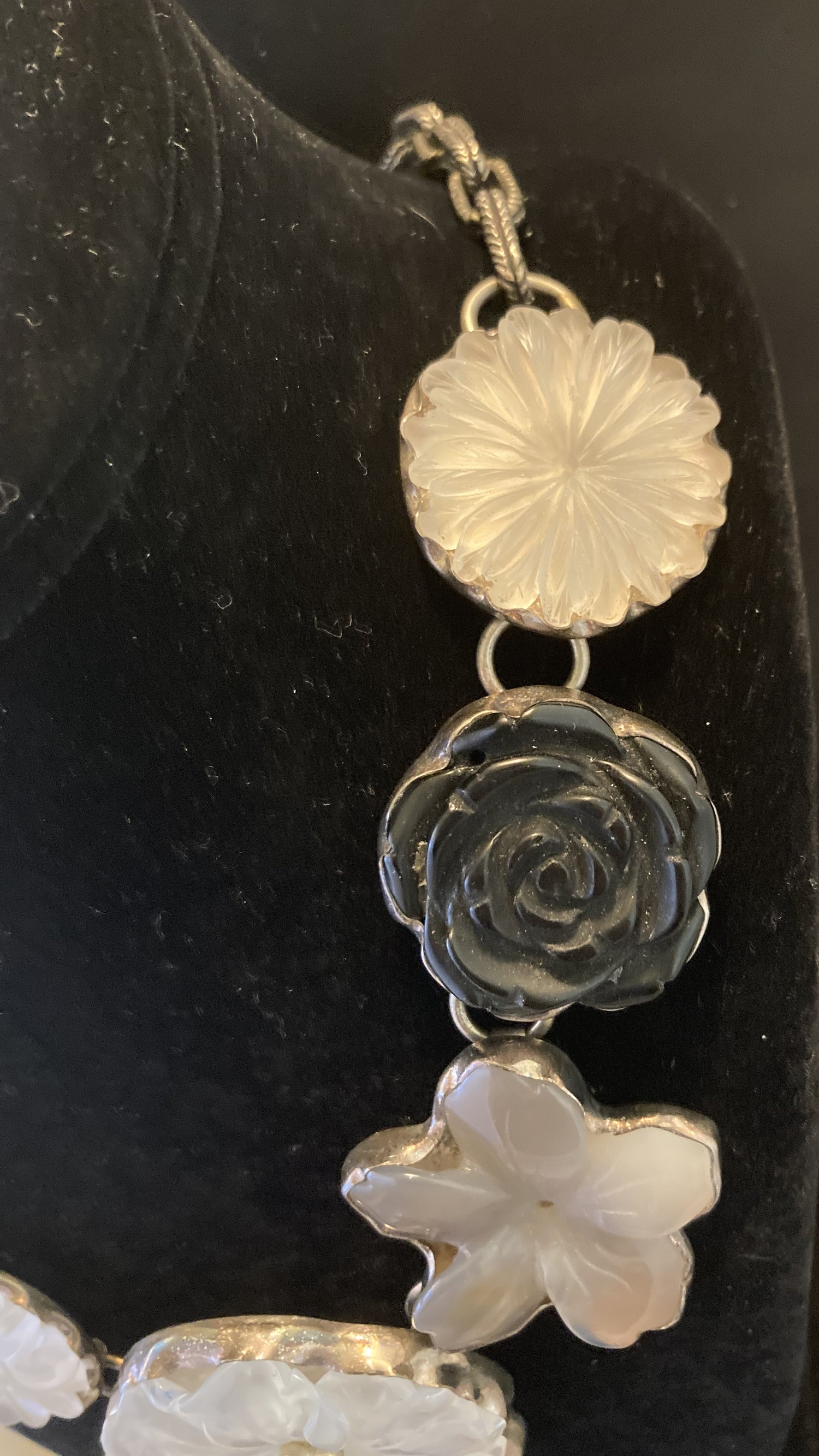 Carved Black and White Crystal Qtz., Jet Flowers Mineral Necklace