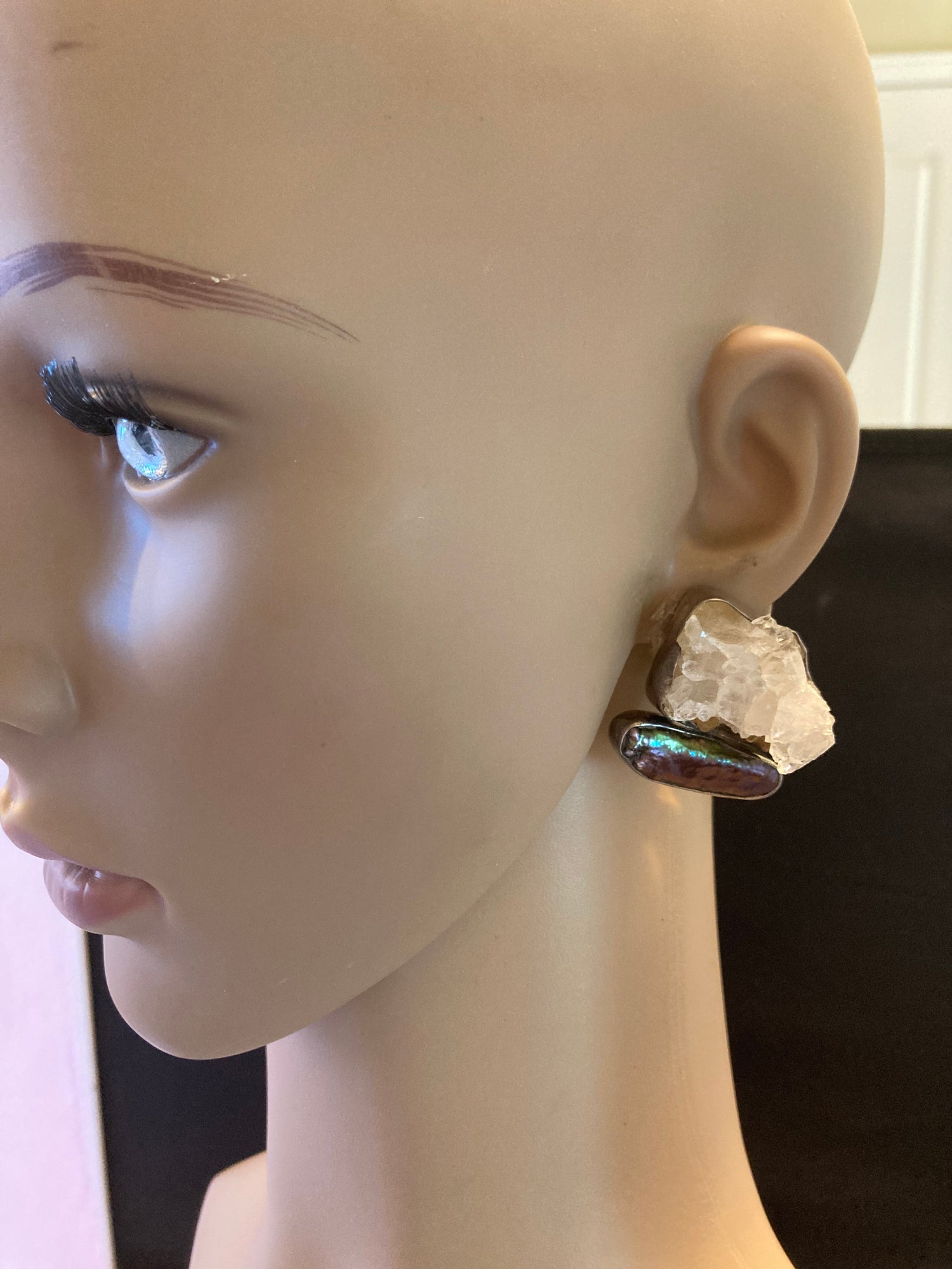 Raw Crystal Quartz, Gray Iridescent Pearl Earring (not perfectly matched, natural characteristics)