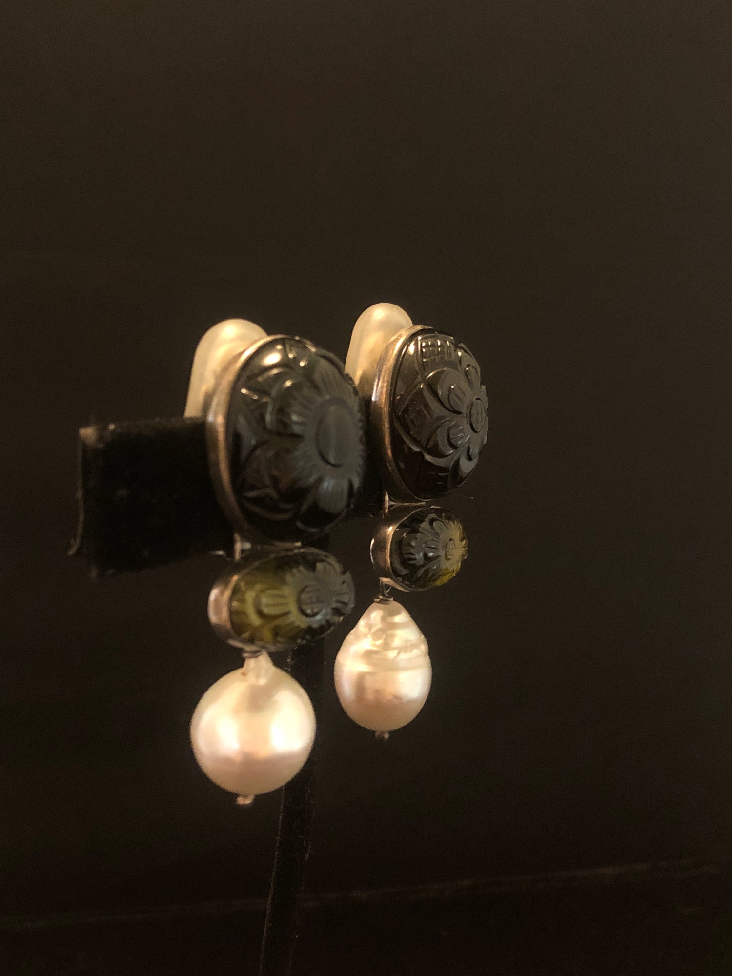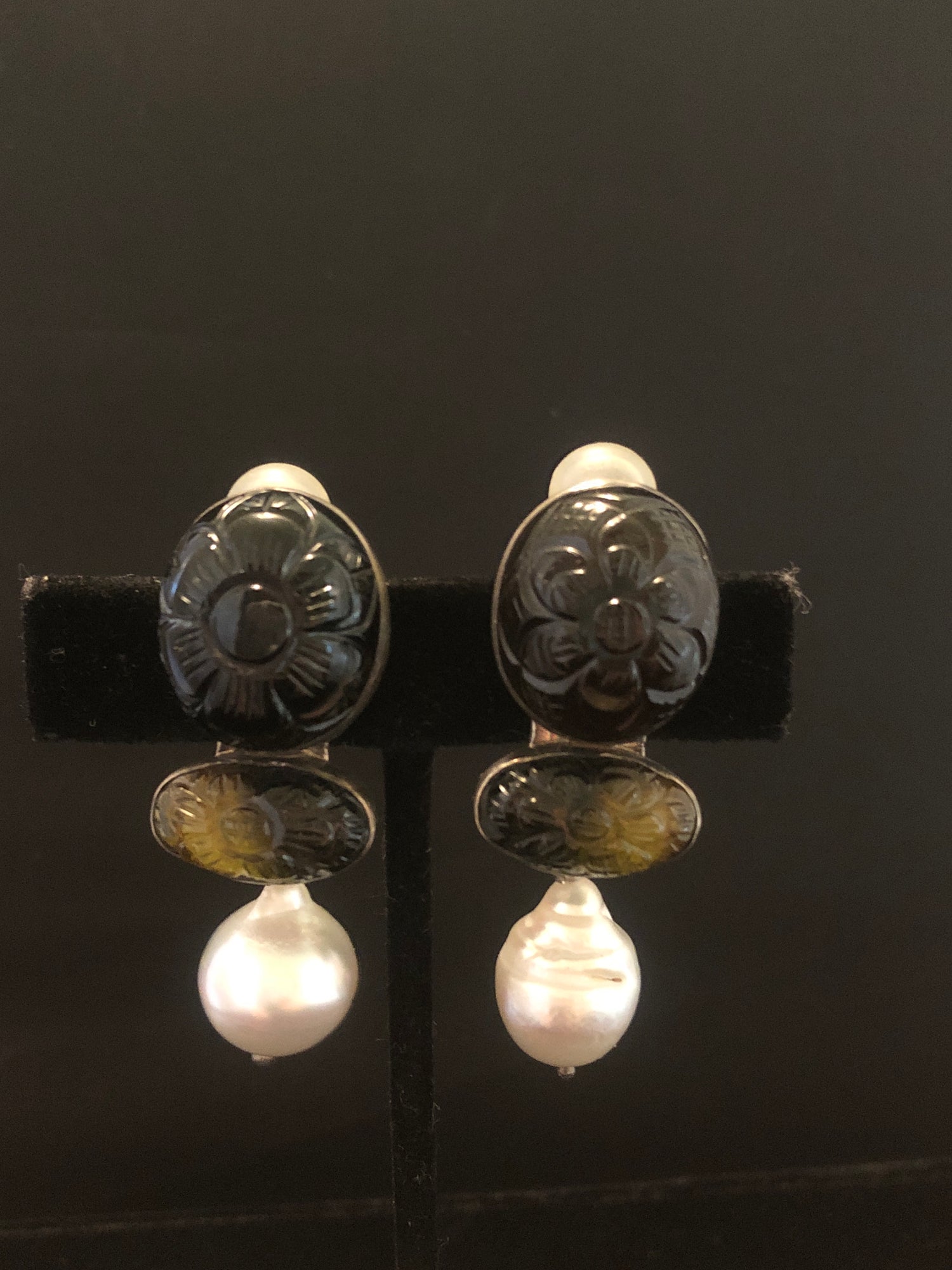 Dark Brownish/Black Tourmaline, Dark Green Tourmaline, White South Sea Pearl Earring