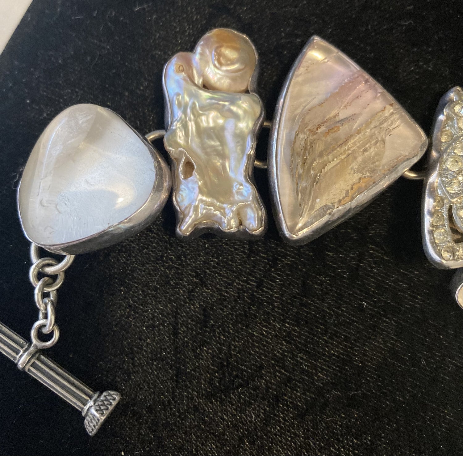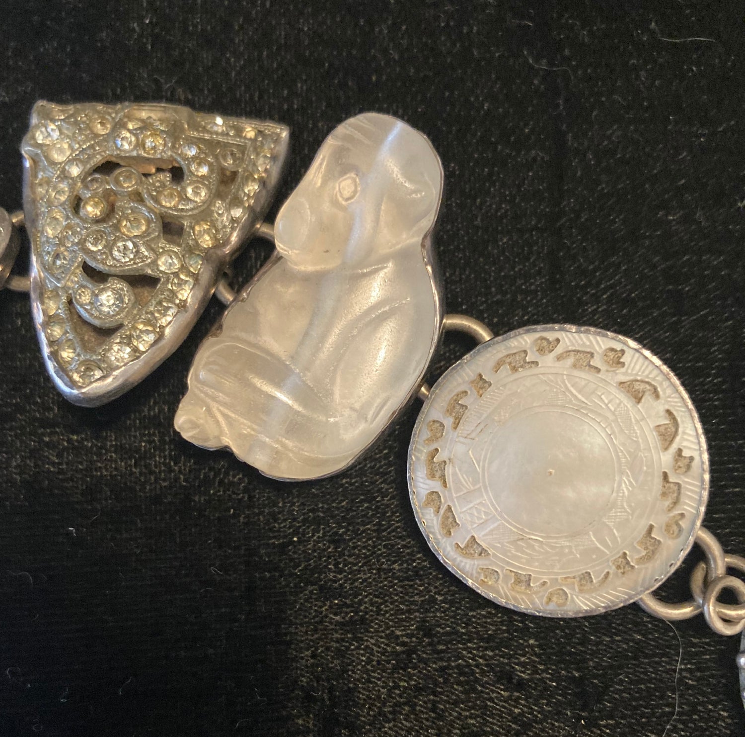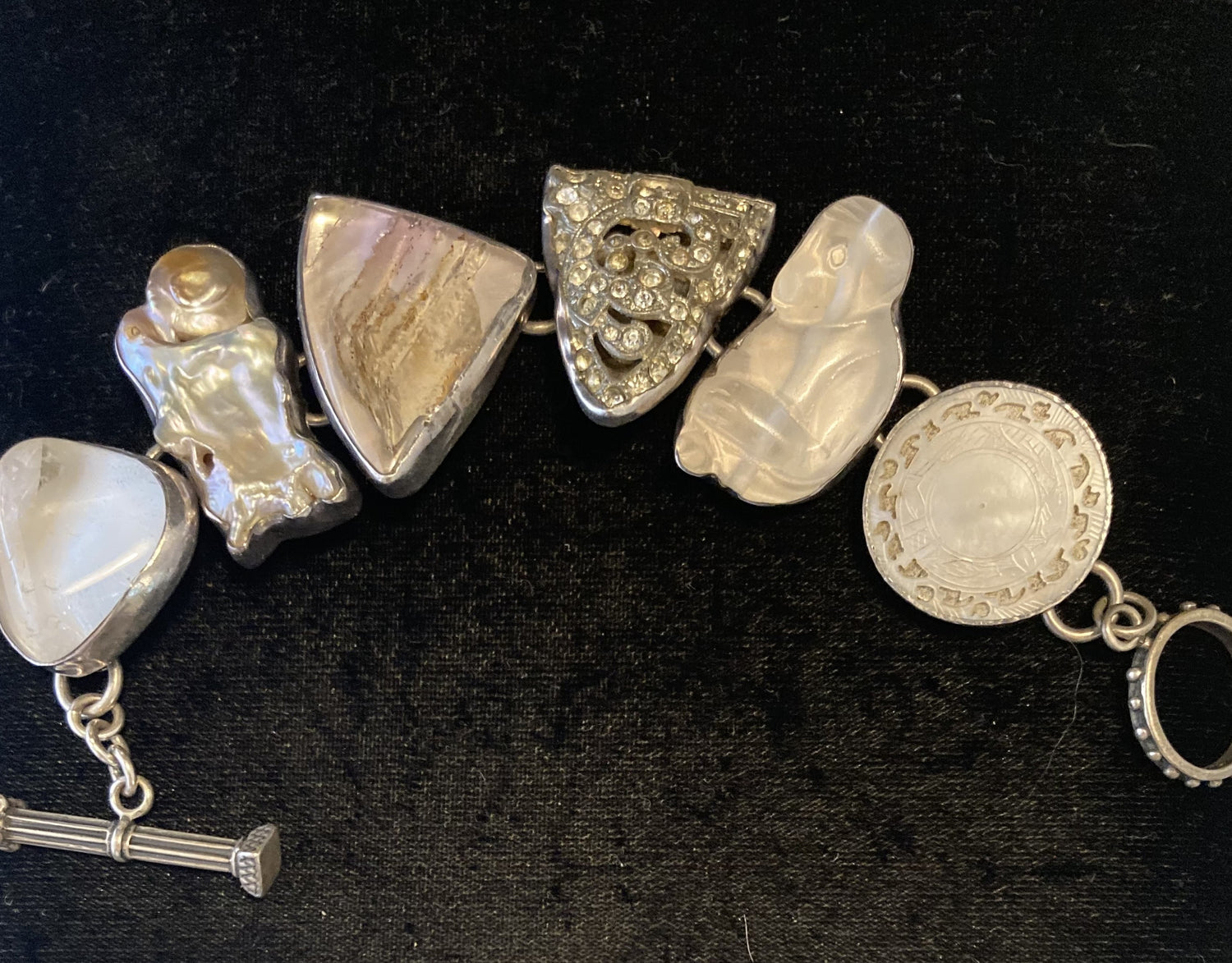Crystal, Biwa Pearl, Rutilated Quartz, Vintage Rhinestone, Carved Crustal Monkey, Antique Pearl Gaming Piece, Sterling Link Bracelet