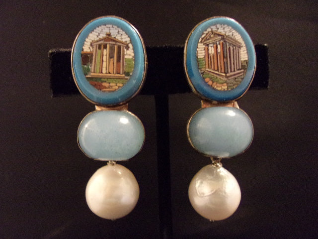 Beautiful Antique Micromosaic, Blue Aquamarine, South Sea Pearl Dangle Earring